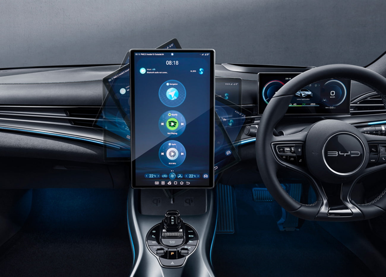 Vô lăng của BYD Seal có thiết kế tương tự các mẫu xe khác của BYD. Màn hình hiển thị điện tử LCD cho người lái có kích thước lớn, mang lại trải nghiệm quan sát và giải trí tuyệt vời, có thể xoay dọc hoặc xoay ngang tùy chỉnh. Đồng thời, cần số pha lê đã được thiết kế lại, nhỏ gọn và khác biệt so với phiên bản lớn trước đây.